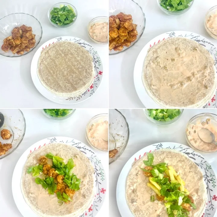 Lay your tortilla flat and spread a generous layer of the sauce in the center. Add the cooked shrimp, followed by fresh lettuce. For an extra crunch, add some French fries.